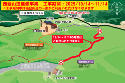 【ただいま山頂西登山道の一部が工事のため歩行できません】工事期間:2025年10月14日(火)~11月14日(金)