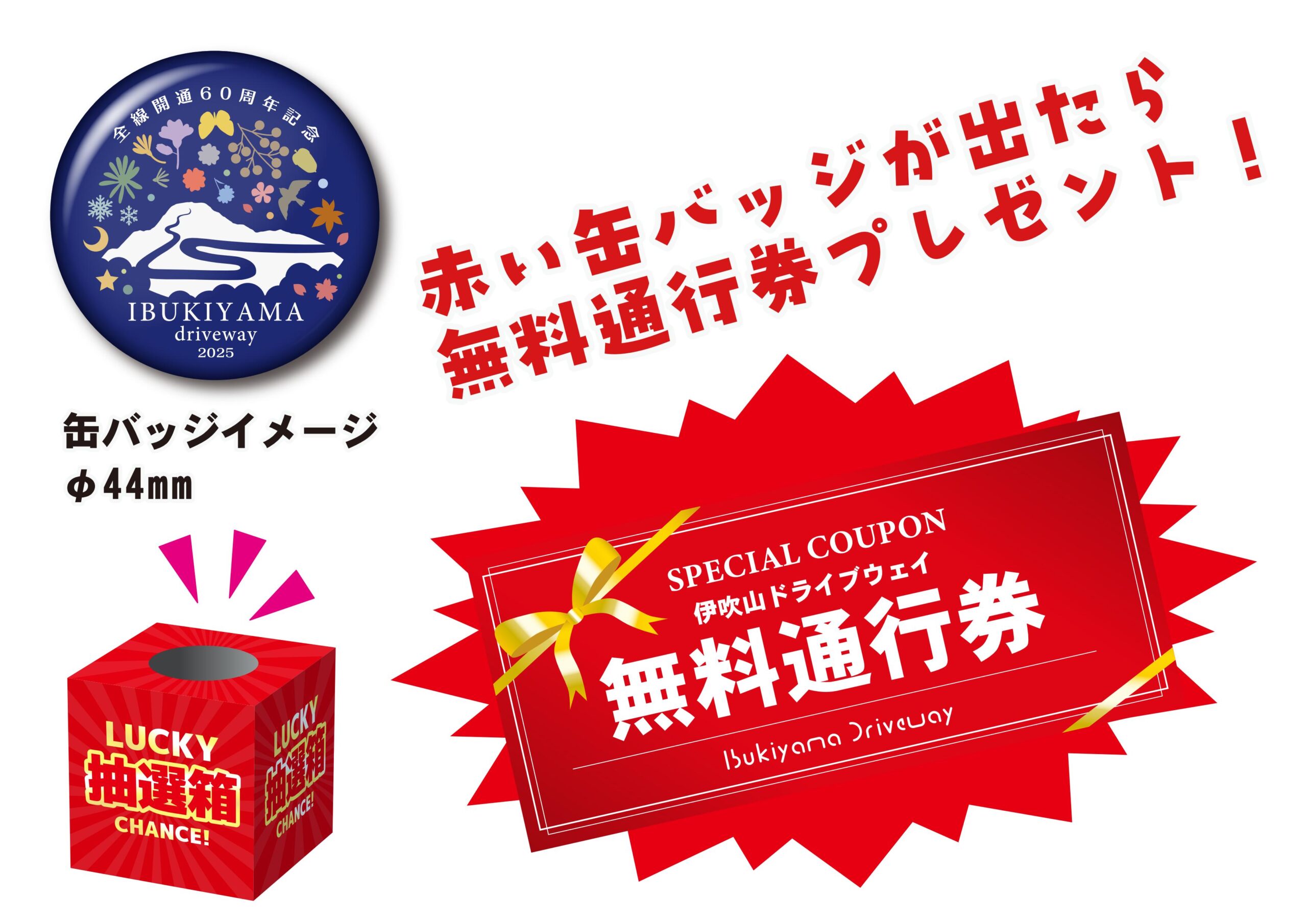 内  容:スカイテラス伊吹山お土産コーナーにおいて、1,000円以上お買い上げいただくと、限定オリジナル缶バッジのくじ引きに挑戦できます!くじ引きBOXから赤色の缶バッジが出たら「伊吹山ドライブウェイ無料通行券」をプレゼントします!