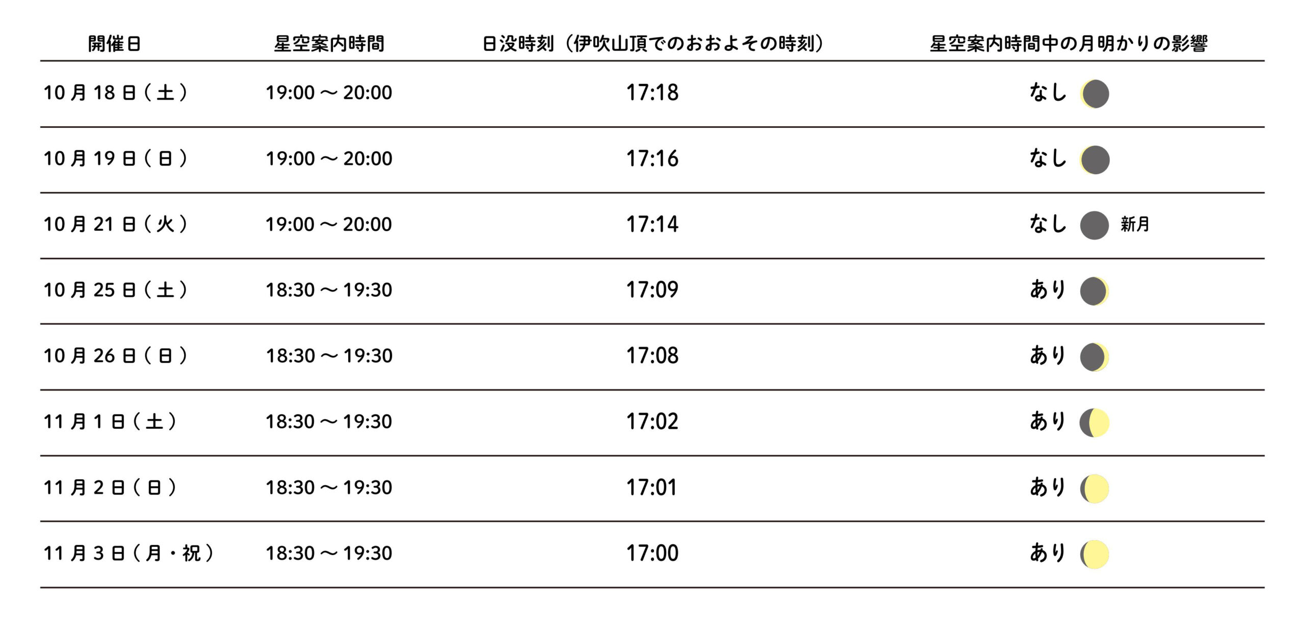 レモン彗星営業時間延長日の特定の日に「秋の星空生解説」を開催します。伊吹山星空ナビゲーターが当日の見頃の星や星座を生解説でご案内します。レモン彗星と合わせてぜひお楽しみください。